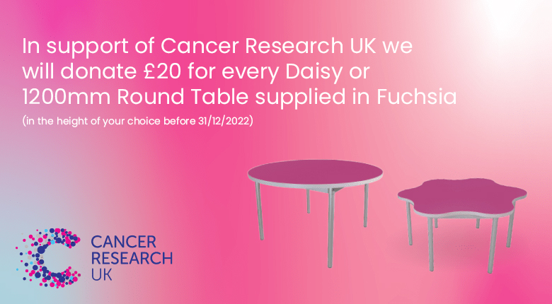 Fund raising for Cancer Research UK Latest News For the rest of 2022 we are running a special promotion in support of Cancer Research, whereby we pledge to donate £20 for every Daisy or 1200mm Round table sold with a Fuchsia top and light grey edge.