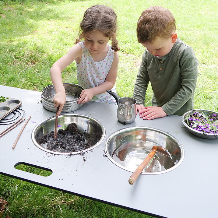 Taking the basic design principles of our popular lightweight folding table and utilising the unique fail-safe folding mechanism, we have developed the new folding mud kitchen with an extremely durable, hard-wearing and weather resistant top. Featuring smart imaginary hot plates and two holes in the table top to house the supplied stainless steel bowls, the revolutionary folding mud kitchen provides a great platform for free play and exploration and will withstand the rigours of constant use. Children can enjoy the delights of squishing with mud, making mud pies, concocting recipes and generally having lots of fun.